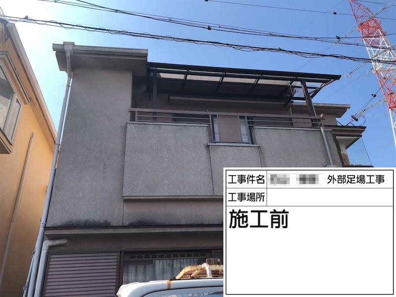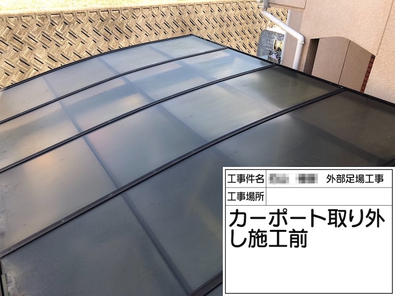 足場の設置でカーポートの屋根の一部が干渉するため、設置時に干渉する部分のカーポートの屋根を取り外しました。