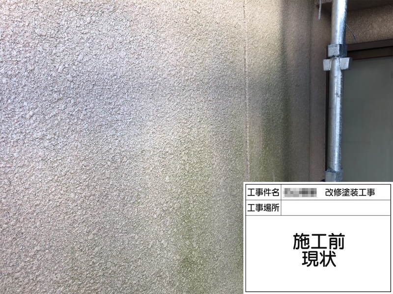 ご相談をいただいてから現場調査の際に建物の状態を見させていただいたところ全体的に経年劣化が見られ、汚れや苔の発生、鉄部のサビなどの症状が確認できました。