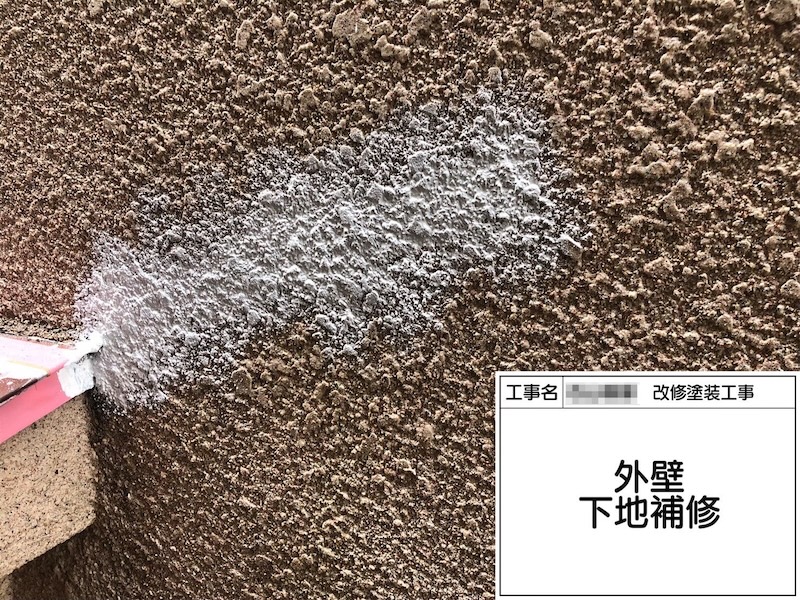外壁にはクラックが発生していたため、塗装前に補修を行っています。