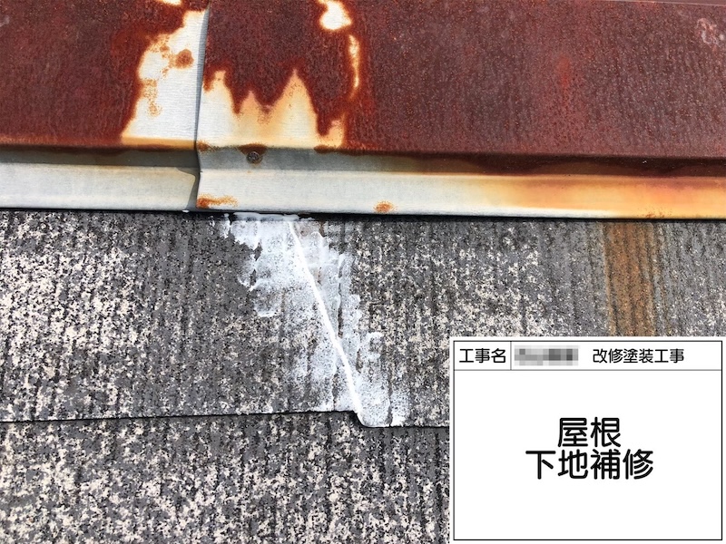 既存スレートにひび割れがありましたので、シーリングで補修してから塗装を開始します。